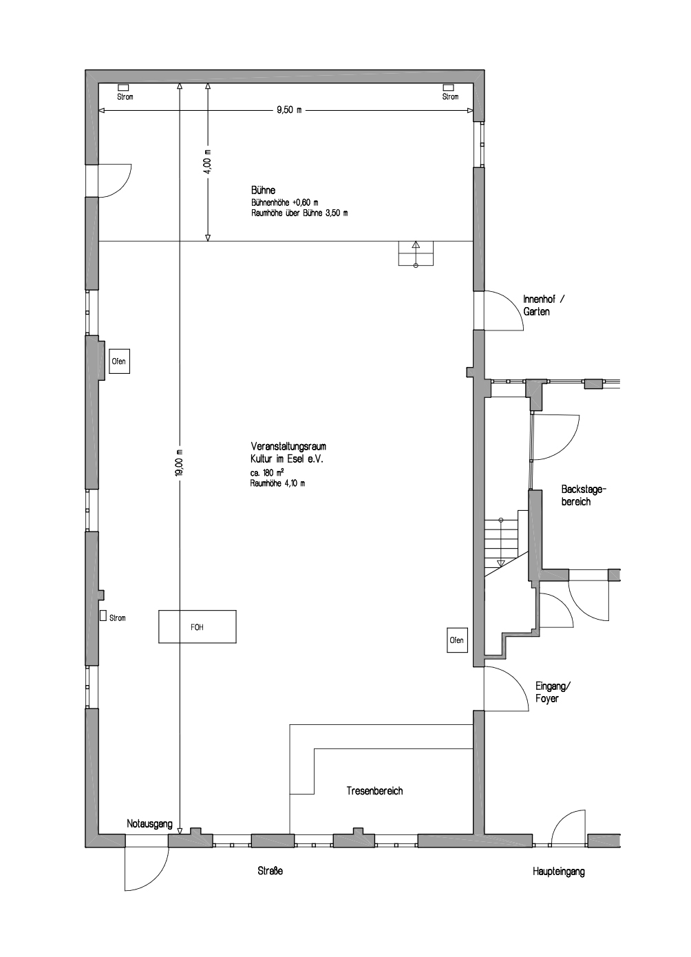 Es steht ein über 180 qm großer Raum mit einer knapp 40 qm großen Bühne zur Verfügung.